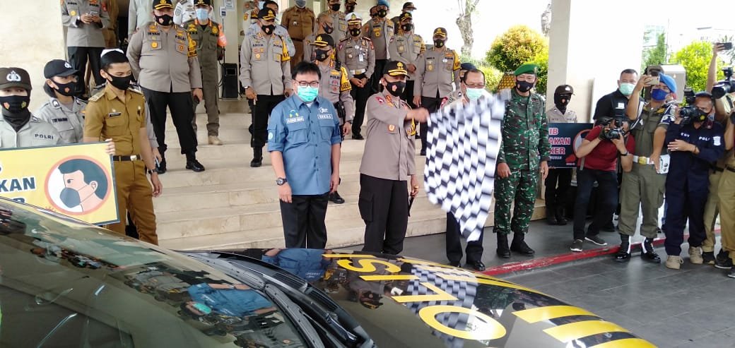 NASIONALXPOS.CO.ID, PALEMBANG – Kapolda Sumsel, Irjen Pol Prof Dr Eko Indra Heri S MM, melepas Tim Penegakan Hukum (Gakkum) Penindakan Pelanggaran Protokol Kesehatan (Prokes) Covid-19, di halaman Grand Atyasa Convention Center Palembang, Selasa (22/9/2020).