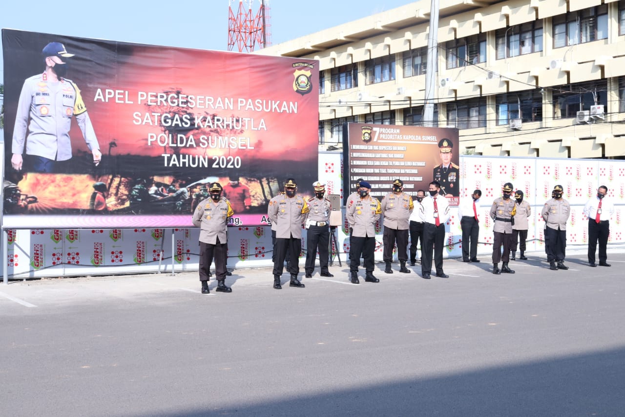 NASIONALXPOS.CO.ID, PALEMBANG – Kapolda Sumsel Irjen Pol Prof. Eko Indra Heri S MM, memimpin apel pergeseran pasukan Satgas Kebakaran Hutan dan Lahan (Karhutla) Polda Sumsel ke Polres Muba, Banyuasin, Ogan Ilir, OKI dan PALI, di lapangan apel Mapolda Sumsel, Senin (10/8/2020).