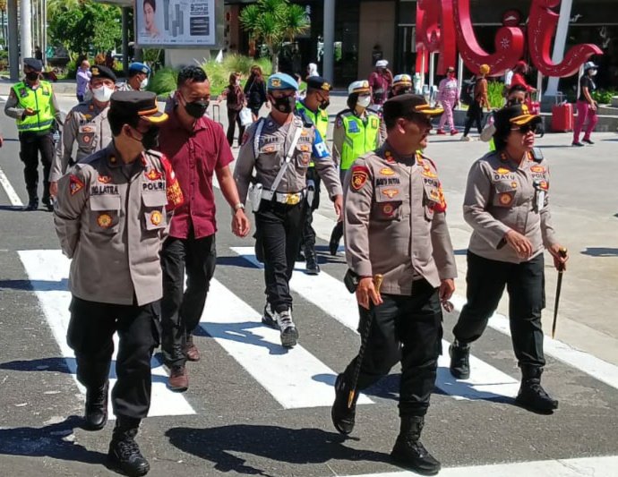 Kapolres Kawasan Bandara I Gusti Ngurah Rai AKBP Ida Ayu Wikarniti, S.E. mendampingi Kapolres Gianyar AKBP I Made Bayu Sutha Sartana, S.I.K., M.H. mengunjungi anggotanya yang mendapat tugas pengamanan Ops Puri Agung V bergabung di Satgas 2 Pam Bandara, selasa (24/05/2022).
