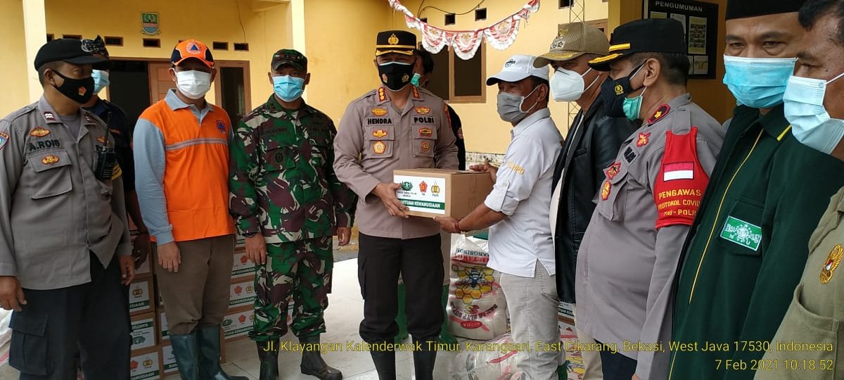 “kami dari polres metro Bekasi bersama beberapa petugas dan di dampingi kapolsek Cikarang timur, mendatangi korban banjir yang merendam ratusan kepala keluarga di desa karang sari, untuk memberikan bantuan pangan, termasuk tadi membagikan masker kepada para korban banjir di tempat tersebut,” tutur kapolres metro Bekasi Kombespol Hendra Gunawan.