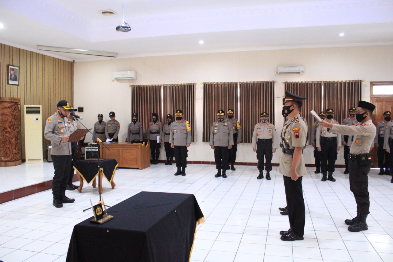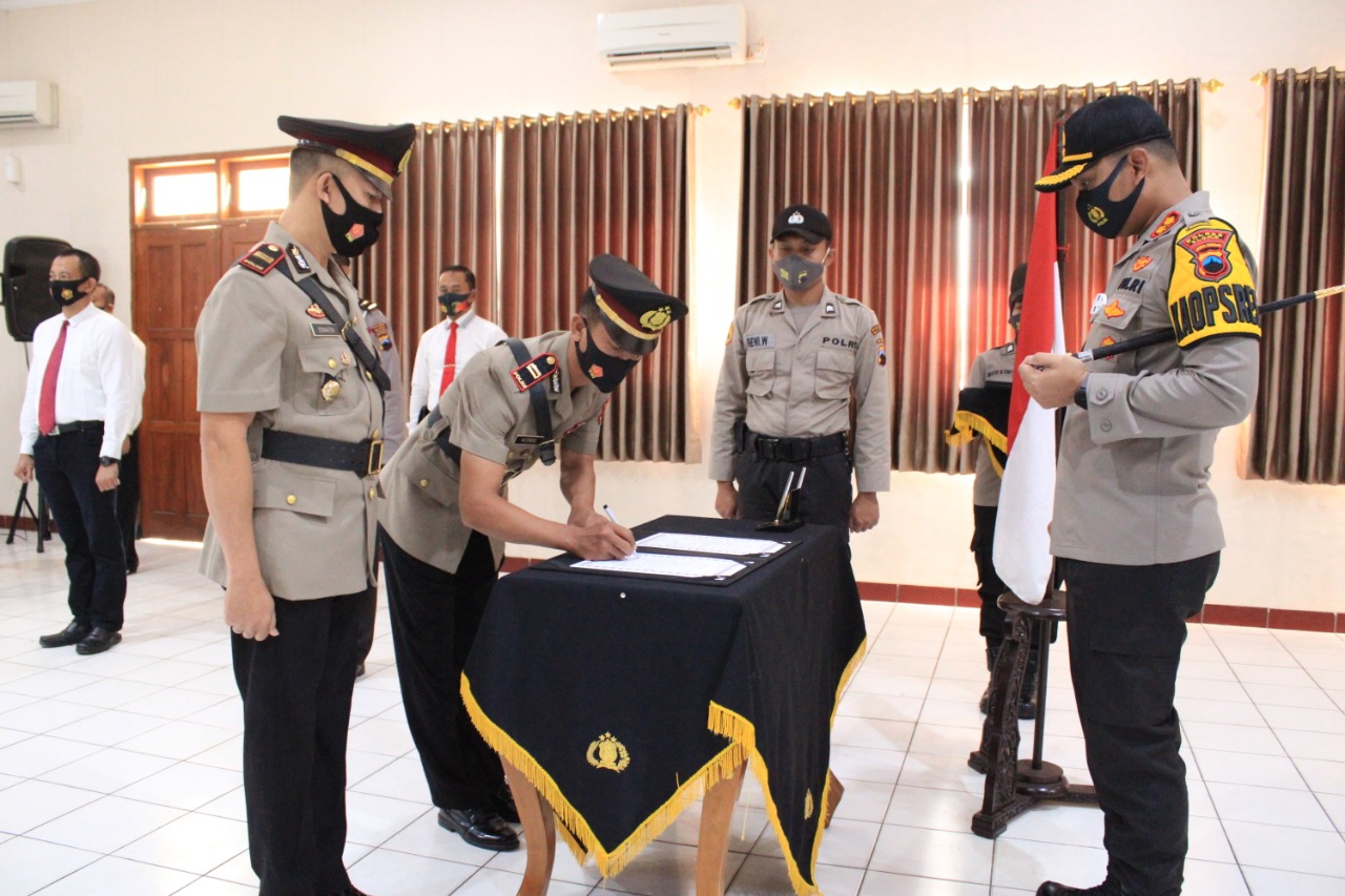 BLORA – Kapolres Blora Polda Jawa Tengah AKBP Ferry Irawan,S.I.K. memimpin upacara serah terima jabatan Kasat Sabhara dan Kapolsek Todanan di Aula Arya Guna Polres Blora, Sabtu, (15/8/2020).