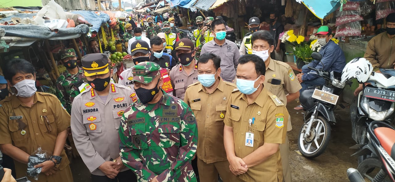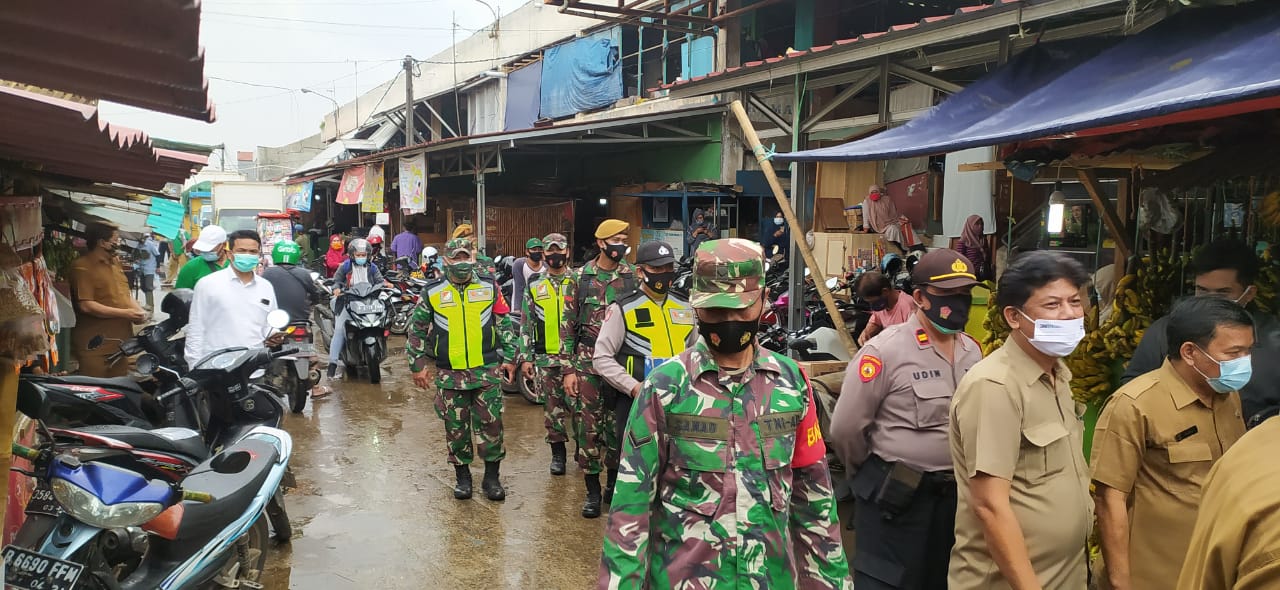 NASIONALXPOS CO.ID, BEKASI – Suasana pasar tambun nampak berbeda seperti hari biasanya, saat kapolres metro Bekasi Kombespol Hendra Gunawan dan Dandim 0509 Letkol Kav Tofan Tri Anggoro dan unsur muspika kecamatan tambun selatan, mendatangi para pedagang untuk memberikan masker secara gratis dan juga memberikan edukasi akan pentingnya menerapkan protokol kesehatan.