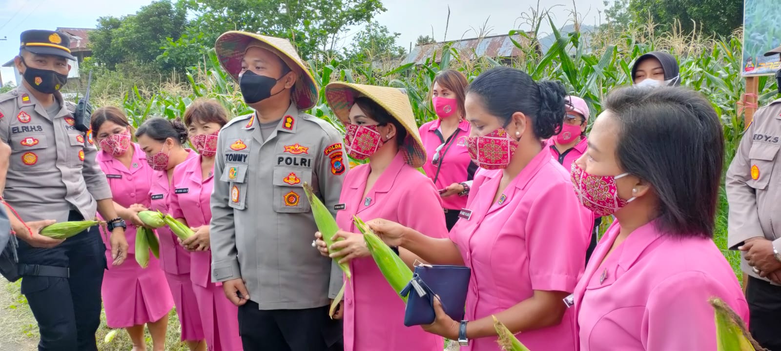 Panen perdana jagung dilakukan Ketua Bhayangkari Cabang Minahasa dr Imelda Tommy Bambang Souissa bersama pengurus dan anggota.