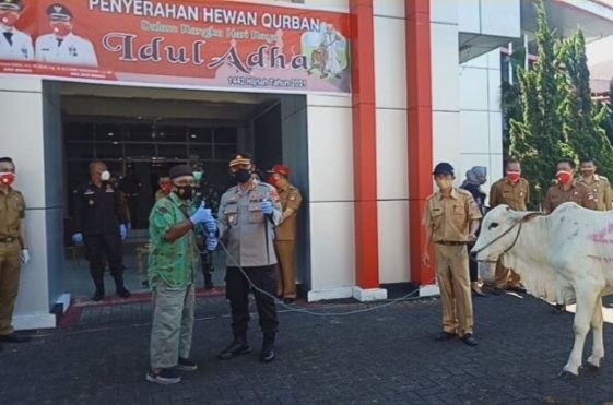 NASIONALXPOS.CO.ID, MINAHASA – Dalam rangka hari raya Idhul Adha 1442 Hijriyah, Kapolres Minahasa AKBP. Tommy Bambang Souissa., SIK mendampingi Bupati Minahasa DR. Ir. Royke Octavian Roring., MSi (ROR) dan Wakil Bupati Minahasa DR. Robby Dondokambey., SSi., MM (RD) bersama Forkopimda Minahasa, menyerahkan 34 ekor sapi kurban secara simbolis di halaman Kantor Bupati Minahasa, Senin (19/07/2021).