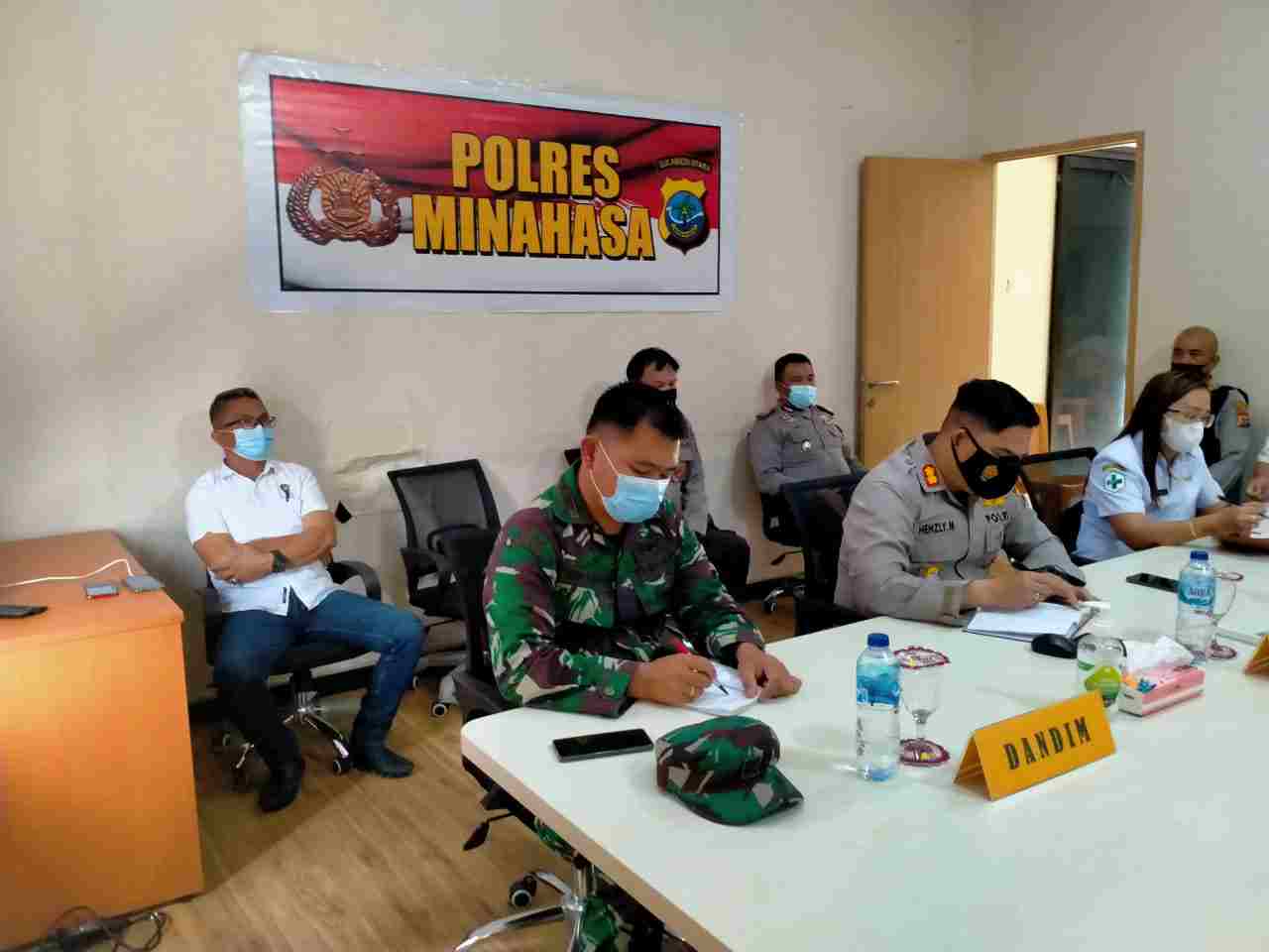Sementara Kapolres AKBP Henzly Moningkey SIK MSi bersama pejabat utama, Kapten Inf Denny Lumentah mewakili Dandim 1309 Minahasa, Kadis Kesehatan Minahasa dr Maya Rambitan bersama staf, mengikuti dari Ruang Vidcon Lantai 2 Mapolres Minahasa.