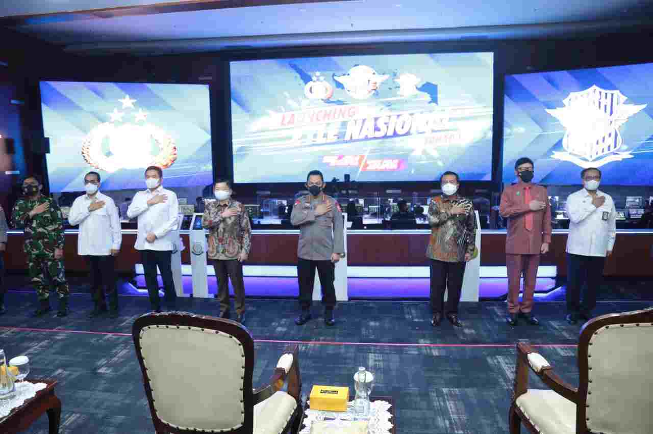 Launching Etle tahap 1 digelar di gedung NTMC Polri, Jakarta, Selasa (23/3/2021). Acara ini dihadiri oleh Ketua Mahkamah Agung Muhammad Syarifuddin dan Jaksa Agung TB. Hassanudin yang turut dalam penandatangan Memorandum Of Understanding (MoU) penegakan hukum.