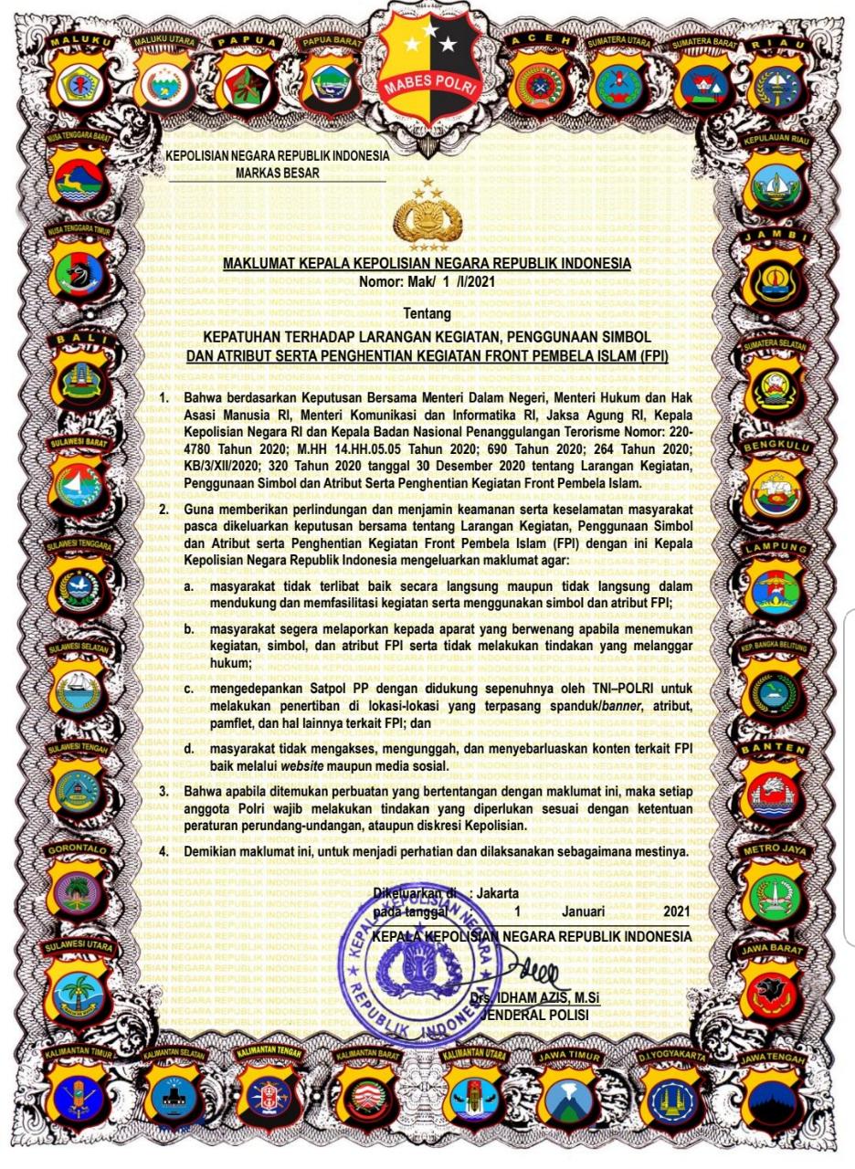 NASIONALXPOS.COID, SERANG-Kapolri Jenderal Pol Idham Azis menerbitkan maklumat bernomor Mak/1/I/2021 tentang Kepatuhan Terhadap Larangan Kegiatan, Penggunaan Simbol dan Atribut serta Penghentian Kegiatan Front Pembela Islam (FPI) pada Jumat (1/1/2021).
