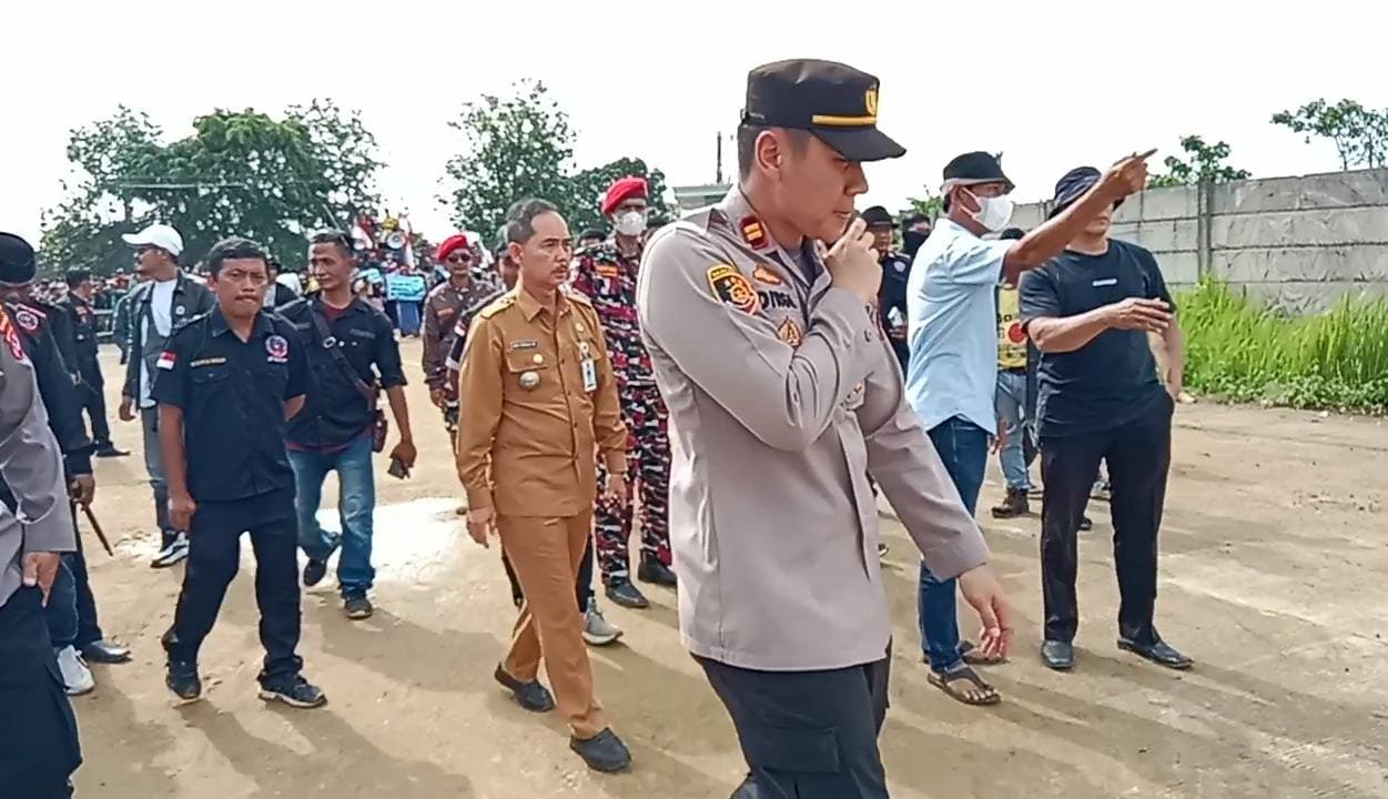 NASIONALXPOS.CO.ID, SERANG – Kapolsek Jawilan Polres Serang IPTU Dirga Abriawan,.S.Tr.K,.S.I.K,.bersama personil melaksanakan pengamanan aksi unjuk Rasa bertempat kavling industri, desa majasari, kecamatan Jawilan, kabupaten Serang, Senin (3/4/2023).