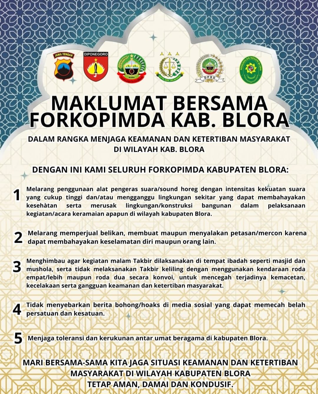 Imbauan tersebut disampaikan sebagai tindak lanjut dari surat edaran Maklumat Bersama Forkopimda Kabupaten Blora yang berisi sejumlah aturan serta larangan bagi masyarakat selama momentum menjelang Idul Fitri.