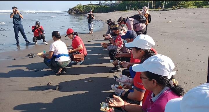 Sebelum pelepasan tukik, terlebih dahulu dilaksanakan bersih-bersih pantai khususnya dari sampah plastik. Dan juga dilakukan penanaman bambu kuning dan Paku Pakis di area pinggir pantai.