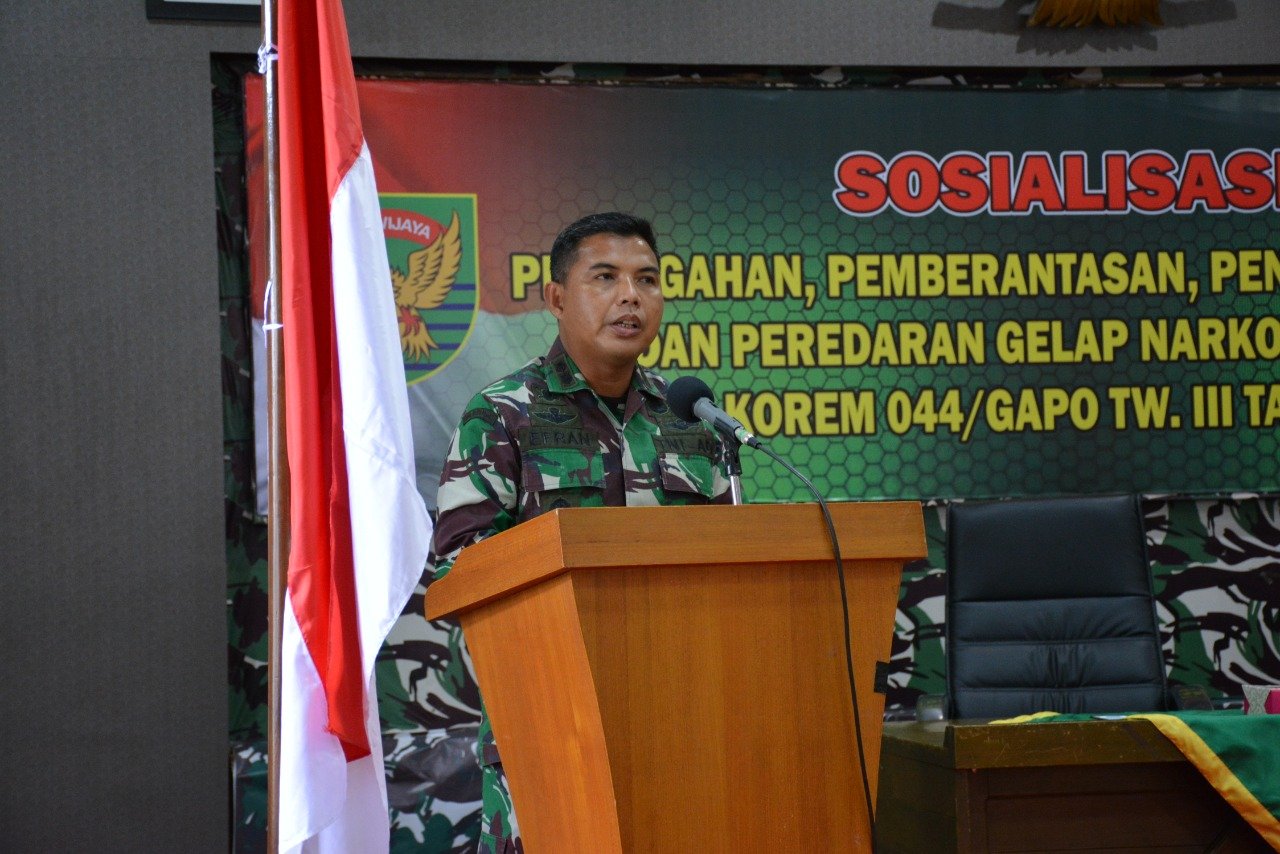 Kasi Intel Korem 044/Gapo, Letkol Inf Efran Herriyanto mengatakan, kegiatan sosialisasi ini bertujuan untuk membangun kesepakatan dan peran serta satuan jajaran Korem 044/Gapo untuk peduli terhadap bahaya narkoba dikalangan Prajurit sertabPNS Korem 044/Gapo.