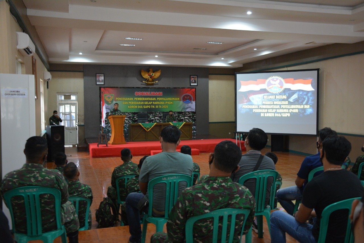 “Di laksanakannya sosialisasi P4GN ini, dapat menambah wawasan para Prajurit dan PNS Korem 044/Gapo, sehingga mampu menjaga dan melindungi diri bahkan keluarga terlebih anak-anak, agar tidak terpengaruh ataupun terlibat pengedaran dan penyalahgunaan Narkoba jenis apapun,” jelas Kasi Intel.