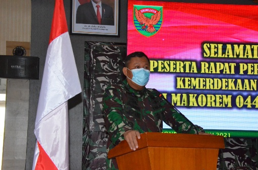 Kasrem 044/Gapo, dalam sambutannya saat membuka rapat mengatakan, Rakor ini bertujuan menyamakan persepsi dalam persiapan rangkaian HUT ke-76 Kemerdekaan RI tahun 2021 dan latar belakang pelaksanaan HUT RI ke-76 sebagai momentum untuk menunjukkan semangat, rasa cinta, dan bangga sebagai anak bangsa di tengah suasana pandemi COVID-19.