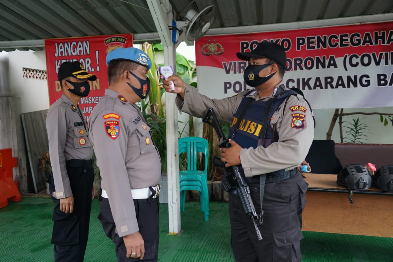 Dengan terlebih dahulu di lakukan pemeriksaan suhu tubuh, baik petugas maupun warga yang akan masuk ke Mapolres Metro Bekasi di lakukan petugas yang berjaga di pos penjagaan, usai di lakukan pemeriksaan suhu tubuh, baik petugas maupun warga juga di minta untuk mencuci tangan dan kemudian masuk ke dalam tempat yang telah di semprotkan cairan disinfektan.