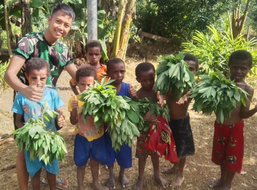 Dengan bangga dan penuh haru Dankipur I Satgas Yonif 143/TWEJ Kapten Inf Agus Rahman menyambut anak-anak kampung yang membawa beberapa ikat daun singkong untuk diberikan kepada Satgas sebagai wujud rasa cinta dan sayang mereka kepada TNI.