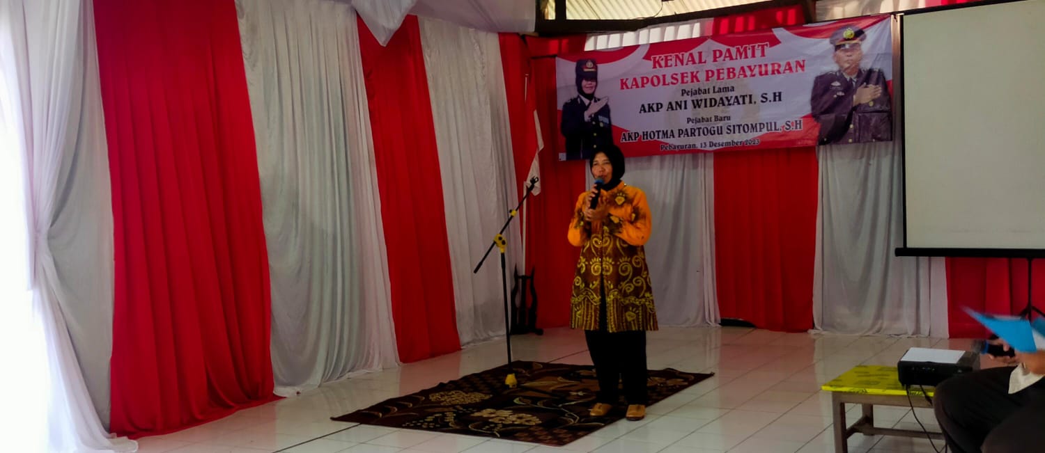 Dalam kesempatan itu, AKP Ani Widayati yang kini menjabat sebagai Kapolsek Setu harus pamit dari Masyarakat Pebayuran, padahal dirinya mengatakan cukup betah bertugas di Polsek Pebayuran, luas lahan pertanian serta kultur masyarakatnya yang masih penduduk asli sehingga segala hal yang terjadi di lapangan bisa di komunikasikan dengan baik.