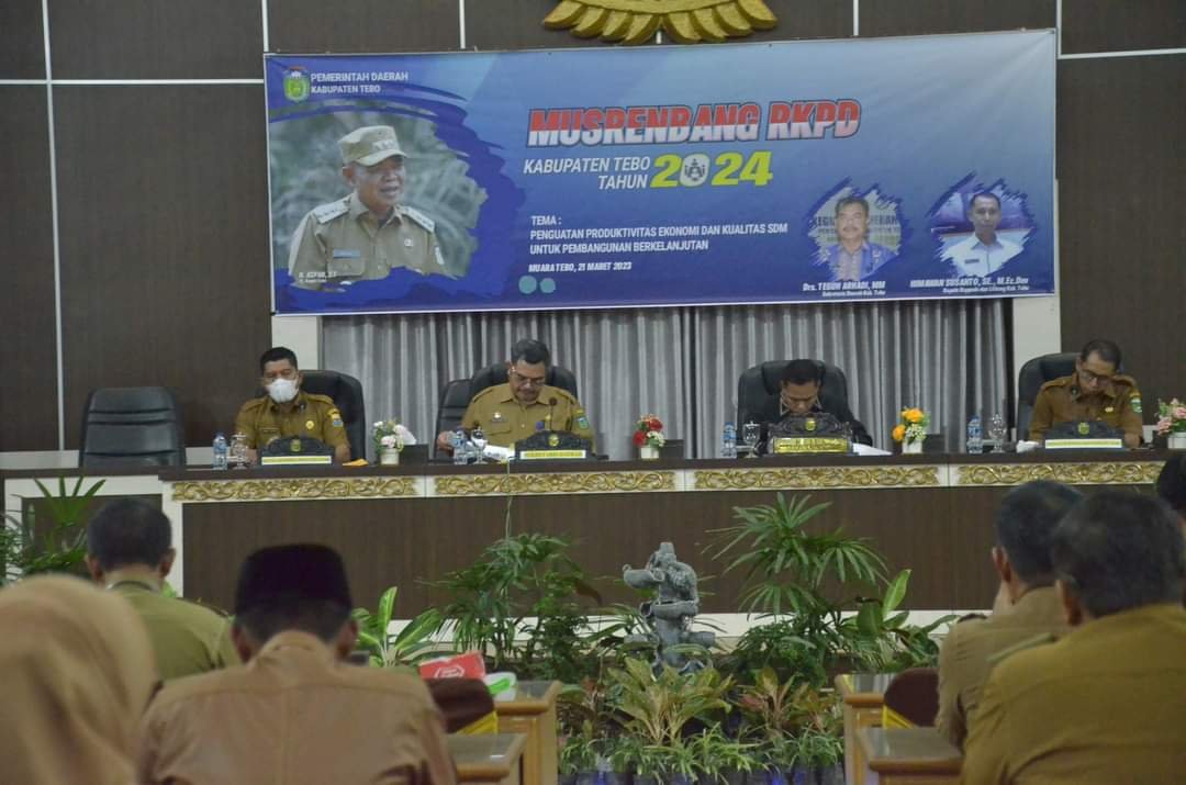 Diawali dengan pembukaan yang dilanjutkan dengan penyerahan kesempatan kepada Sekretaris Daerah Kabupaten Tebo Drs. Teguh Arhadi M.M. untuk membuka secara resmi pelaksanaan Musyawarah Perencanaan Pembangunan Daerah RKPD Kabupaten Tebo T.A. 2024 di Aula Sekretariat DPRD Kabupaten Tebo, Selasa (21/03/2023).
