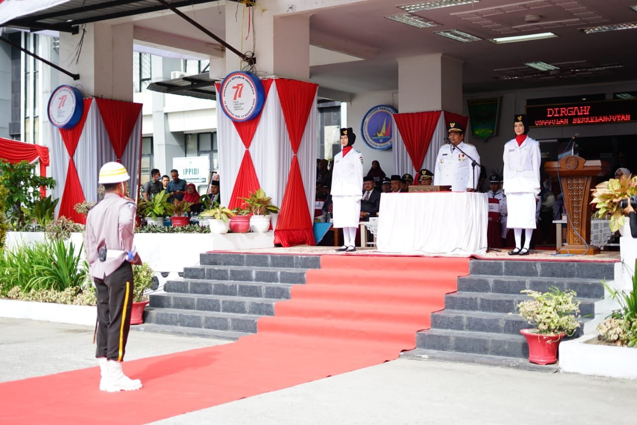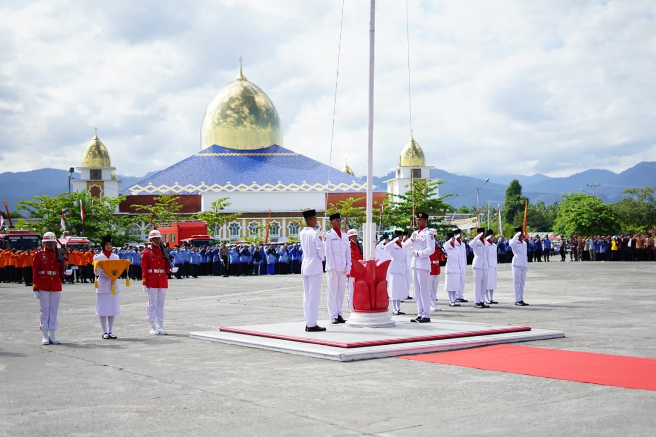 Upacara yang diikuti TNI/polri, Damkar, Satpol PP, satgas bencana, ASN, pelajar dan organisasi kemasyarakatan yang dipimpin langsung oleh Bupati suhatri Bur bertindak sebagai inspektur upacara.