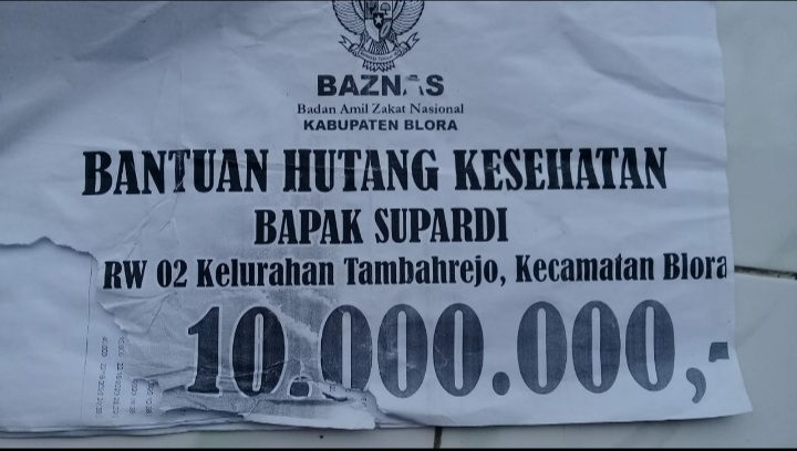 “Sekitar bulan November kalau gak salah, Supardi mendapat bantuan pertama kali terus mau dibelikan beras. Dalam perjalanannya mengalami kecelakaan tunggal di Desa Pelem dan harus dirawat di rumah sakit. Kami bantu mencarikan biaya perawatannya, akhirnya mendapatkan bantuan dari Baznas Blora,” terangnya.