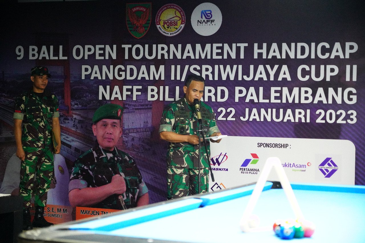 Pangdam II/Sriwijaya dalam sambutan tertulis yang dibacakan Kapok Sahli Pangdam II/Swj, Brigjen TNI Azhar Mulyadi menyampaikan bahwa, even ini merupakan salah satu wujud nyata partisipasi Kodam II/Swj untuk meningkatkan kemahiran dan memberdayakan potensi atlet-atlet Billyard melalui sebuah jenjang kompetisi yang terpadu dan penuh dengan sportivitas dalam suasana persahabatan yang kuat.