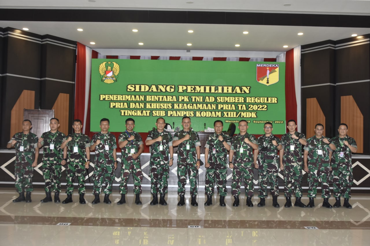 NASIONALXPOSCO.ID,MANADO,-Sebanyak 137 pemuda dari berbagai penjuru wilayah Provinsi Sulawesi Utara, Provinsi Gorontalo dan Provinsi Sulawesi Tengah, mengikuti sidang seleksi akhir Pemilihan Tingkat Pusat Caba PK TNI AD Sumber Reguler dan Keagamaan TA 2022, di Grhadika Jaya Sakti Makodam XIII/Merdeka Manado, Senin (19/9/2022).