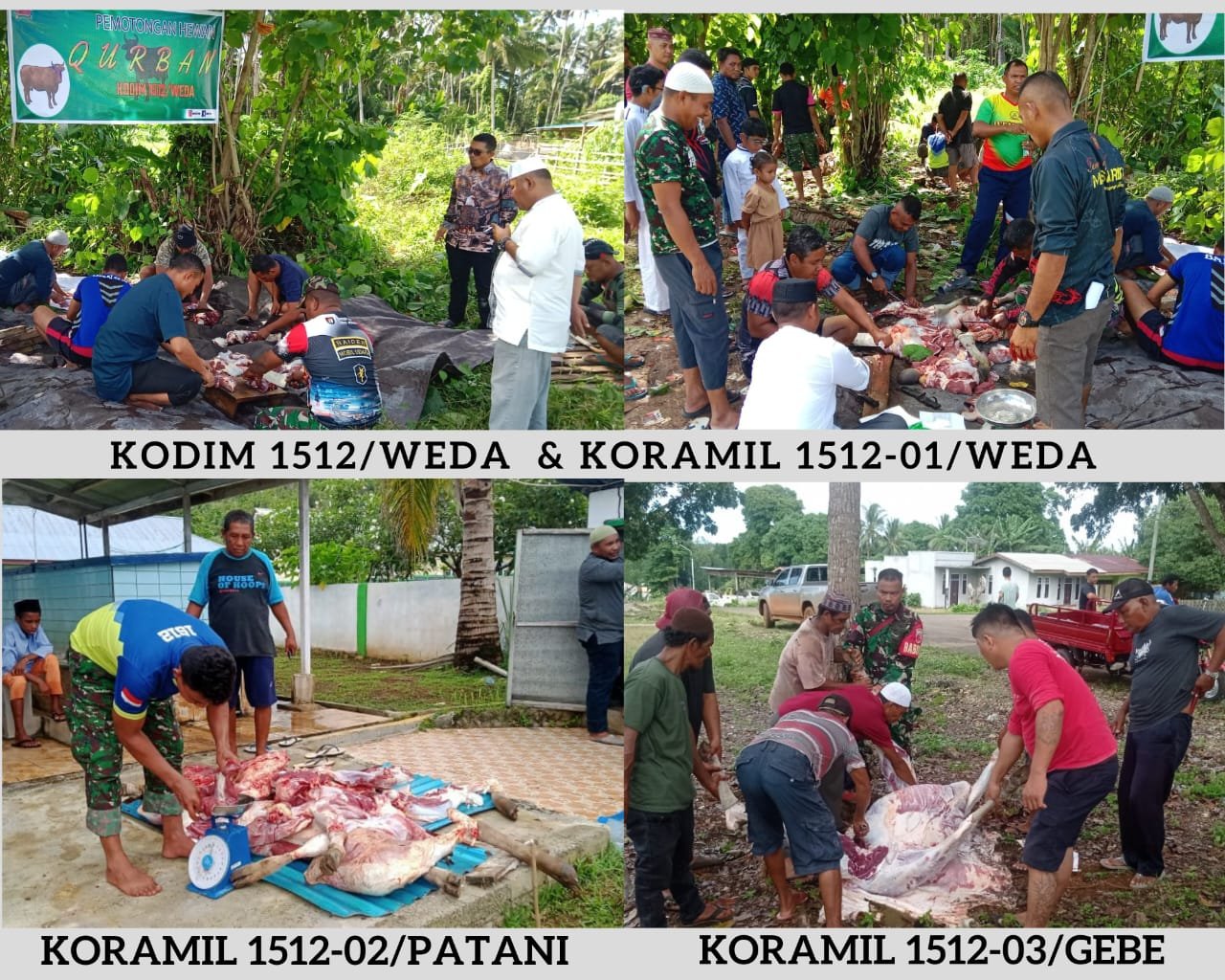 Setiap perayaan hari raya Idul Adha, Kodim 1512/Weda, selalu berpartisipasi untuk ikut berqurban. Misalnya pada Hari Raya Idul Adha 1444 Hijriyah (2023) kali ini. Pemotongan hewan qurban secara simbolis bertempat di Makodim 1512/Weda, yang dihadiri langsung oleh Dandim 1512/Weda Letkol Arh Ali Akbar, S.E, Kasdim 1512/Weda Mayor Kaf Erlan Kase Harahap, Pjs Danramil 01/Weda lettu infantri Jemmy P, Pasi Ter Kodim 1512/Weda Capten Inf Sofyan, Pasi Ops Capten Inf Juliadin , dan sejumlah anggota Kodim 1512/Weda lainnya.