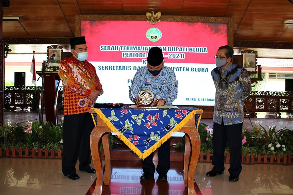 NASIONALXPOS.CO.ID, BLORA – Sekretaris Daerah (Sekda) Kabupaten Blora, Komang Gede Irawadi, SE,M.Si menerima secara resmi estafet kepemimpinan sebagai Pelaksana Harian (Plh) Bupati Blora dari Bupati Blora periode 2016-2021, Djoko Nugroho, Rabu (17/2/2021).