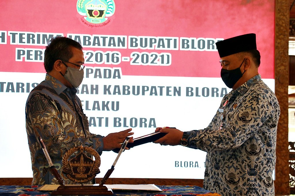 NASIONALXPOS.CO.ID, BLORA – Sekretaris Daerah (Sekda) Kabupaten Blora, Komang Gede Irawadi, SE,M.Si menerima secara resmi estafet kepemimpinan sebagai Pelaksana Harian (Plh) Bupati Blora dari Bupati Blora periode 2016-2021, Djoko Nugroho, Rabu (17/2/2021).