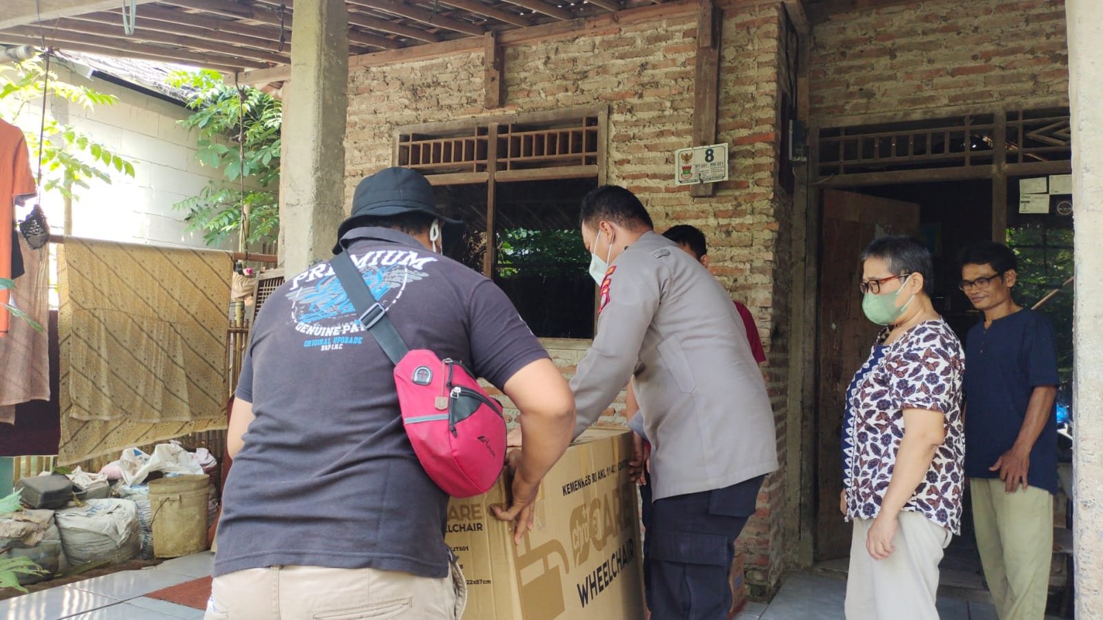 Ibu Lida Melani (58) mewakili Yayasan SAYAP ( Sayangi Anak Yatim Piatu ) menyampaikan donasi sebuah kusrsi roda untuk memudahkan aktivitas ibu Hartati.