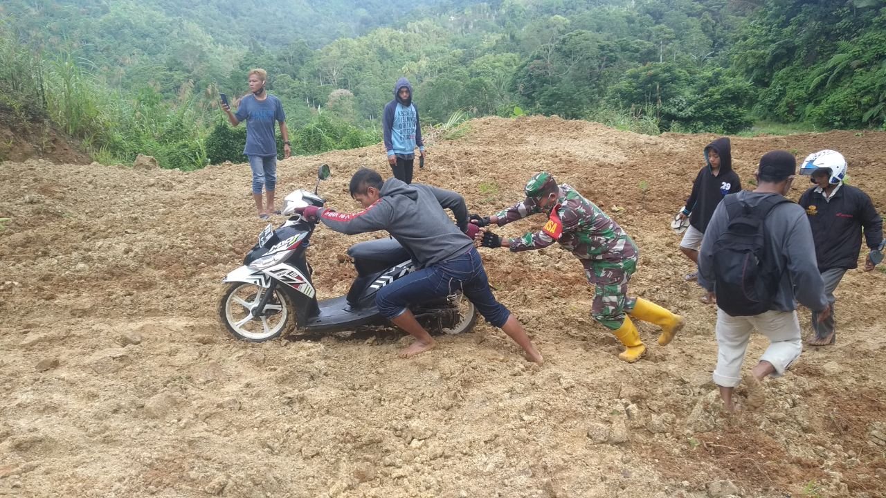 NASIONAL XPOS.CO.ID, BOLTIM-Koramil 1303-03/Modayag,Plh. Danramil kapten inf muyasir s.i.p bersama Anggota turun lokasi TKP Membantu warga dampak tanah turun berupa material tanah yang di akibatkan oleh curah hujan di Jalan Trans Sulawesi penghubung Desa Tobongon dan Desa Badaro, tepatnya di Gunung Potong Ds.Badaro Kec.Modayag Kab.Boltim, pada Minggu Tanggal 02-Agustus- 2020 sekitar pukul 04.35 Wita