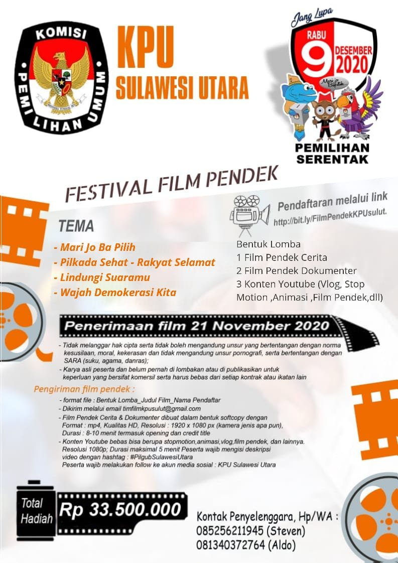 NASIONAL XPOS.CO.ID MANADO, – Untuk mengukur Partisipasi politik masyarakat dalam pelaksanaan pemilihan umum kepala provinsi Sulawesi Utara demi mewujudkan Pilkada yang berkualitas dan berintegritas maka Komisi Pemilihan Umum (KPU) Sulawesi Utara melalui media Film, KPU Sulut meggelar Lomba Film Pendek yang dimulai dari tanggal 3 November sampai Pengumuman Final 30 November 2020 dengan 3 item kategori Lomba yaitu, 1.Filem Pendek (durasi 8-10menit), 2.Filem Pendek Dokumenter (durasi 8-10menit), 3.Konten Youtube (durasi 3-5menit) )) dengan totak Hadiah Rp.33.500.000, Sesuai Penjelasan Komisioner KPU Sulut Kepala Divisi Sdm dan Partisipasi Masyarakat Salman Saelangi, S.Kel. sewaktu dikonfirmasi Wartawan NX, Kamis (5/11/2020).