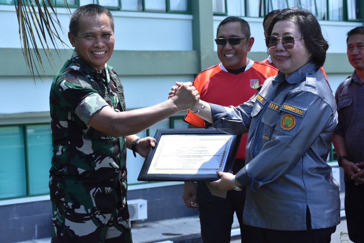 Kasdam XIII/Merdeka menyerahkan piagam penghargaan standar instrumen tanaman palma, dalam rangka peremajaan kembali tanaman pohon kelapa di Makodam XIII/Merdeka.