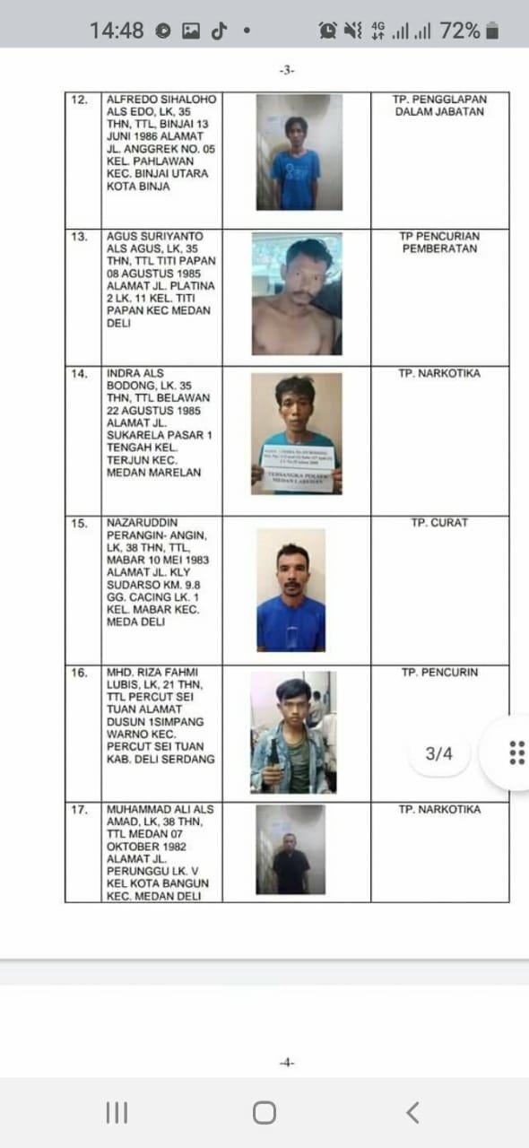 10. Abdul Rasyid Lubis alias Boncel (26) warga Jalan Veteran Pasar VII Gang Telo Kecamatan Labuhan Deli kasus penipuan dan penggelapan.