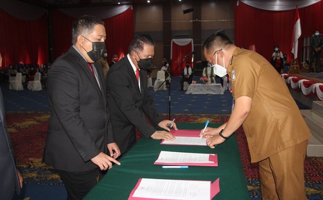 NASIONAL XPOS.CO.ID MANADO |Walikota Manado Andrei Angouw diwakili dr.Richard Sualang melantik Badan Pengawas dan jajaran Direksi PD Pasar dan Direksi PDAM Kota Manado Diruang serbaguna kantor Walikota, Selasa(13/7/2021)