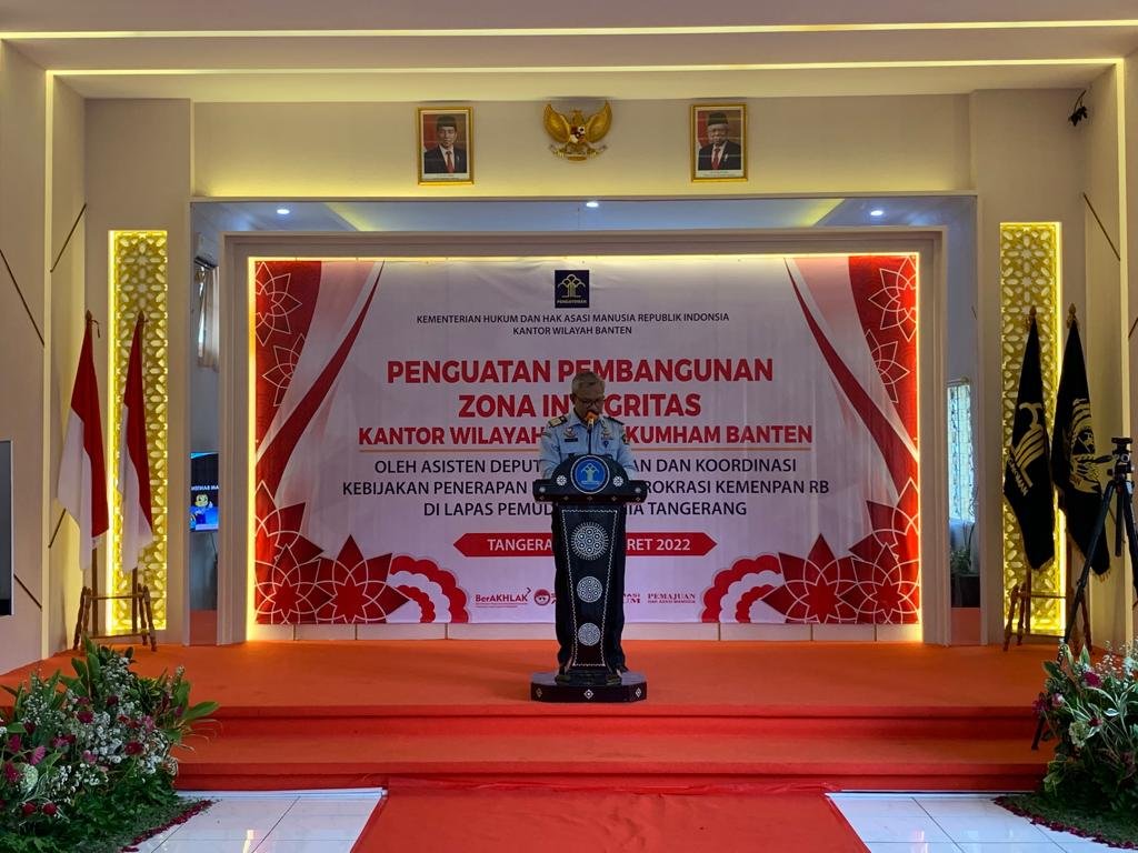 Hadir memberikan penguatan, Bapak Drs. Agus Uji Hantara, M.E. selaku Asisten Deputi Perumusan dan Koordinasi Kebijakan Penerapan Reformasi Birokrasi Kemenpan RB. Turut hadir dalam kegiatan ini, Tejo Harwanto selaku Kepala Kantor Wilayah Kemenkumham Banten didampingi Pimti Pratama Kanwil Kemenkumham Banten, Kadek Anton Budiharta selaku Kalapas Pemuda Kelas IIA Tangerang beserta jajaran Tim Pembangunan ZI Lapas Pemuda Kelas IIA Tangerang; serta dihadiri secara langsung oleh Kepala UPT Pemasyarakatan Se-Tangerang Raya dan diikuti secara virtual oleh Kepala UPT Pemasyarakatan Se-Serang Raya.