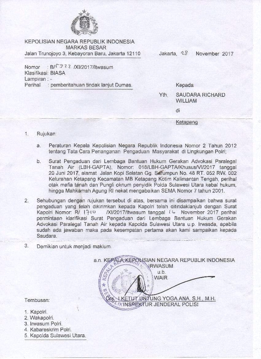 “Kapolri pernah merespon dengan Surat Nomor: R/1710/XI2017/Itwasum tanggal 16 November 2017, perihal permintaan klarifikasi Surat Pengaduan dari Lembaga Bantuan Hukum Gerakan Advokasi Paralegal Tanah Air kepada Kapolda Sulawesi Utara u.p. Irwasda. Sebagaimana surat pemberitahuan tindak lanjut Dumas nomor: B/5922/XI/2017/Itwasum tanggal 28 November 2017, yang ditanda-tangani a.n. Kepala Kepolisian Negara Republik Indonesia Irwasum u.b. Wair Inspektur Jenderal Polisi Drs. I Ketut Untung Yoga Ana, S.H., M.H. ” ungkap Wiliam sosok pembela Hak rakyat.