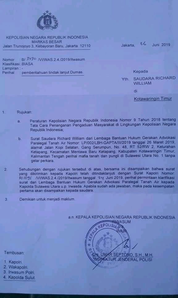 Dia menambahkan bahwa diulang Kembali dengan Surat Kapolri Nomor: R/1095/VI/WAS.2.4./2019/Itwasum tanggal 24 Juni 2019, perihal permintaan klarifikasi surat dari Lembaga Bantuan Hukum Gerakan Advokasi Paralegal Tanah Air kepada Kapolda Sulawesi Utara u.p. Irwasda. Sebagaimana surat pemberitahuan tindak lanjut Dumas nomor: B/3490/VI/WAS.2.4./2019/Itwasum tertanggal 26 Juni 2019, yang dikirimkan kepada Richard William, yang ditanda-tangani a.n. Kepala Kepolisian Negara Republik Indonesia Irwasum u.b. WAIR Inspekur Jenderal Polisi Drs. Umar Septono, S.H., M.H. Namun hingga kini belum juga ada tindak lanjutnya.