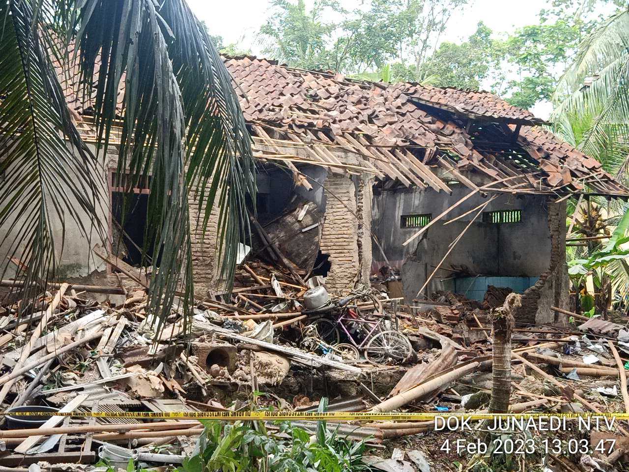 Akibat ledakan keras bangunan rumah bagian belakan hancur berantakan. Dari kerjadian tersebut ternyata penghuni rumah yang bernama NR didapti terpental ke dalam kolam dengan kondisi mengenaskan dan sudah tewas.