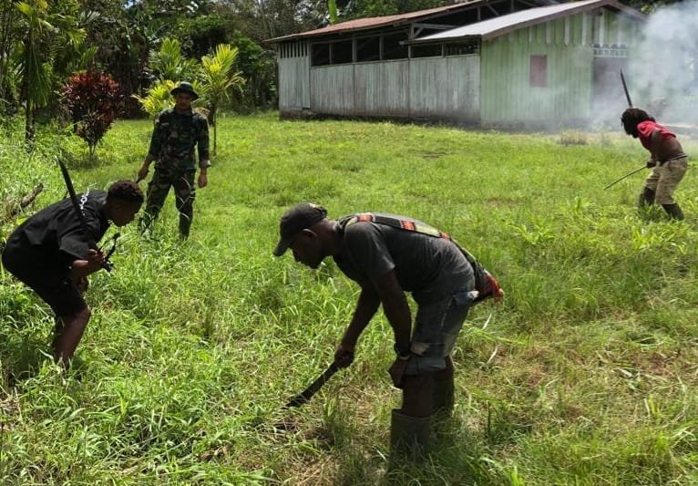 Personel Satgas yang dipimpin langsung Danpos Bompay Serka Iwan Syahroni bersama warga kampung membersihkan lingkungan Gereja, mereka terlihat kompak dan semangat. Hal ini dapat disimpulkan terpeliharanya kerukunan dan toleransi diwilayah tersebut.