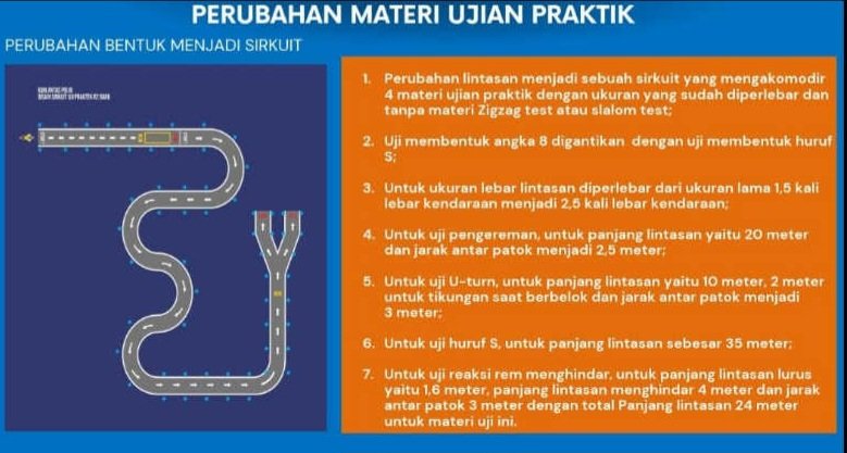 1. Perubahan lintasan menjadi sebuah sirkuit yang mengakomodir 4 materi ujian praktik dengan ukuran yang sudah diperlebar dan tanpa materi Zigzag test atau slalom test;