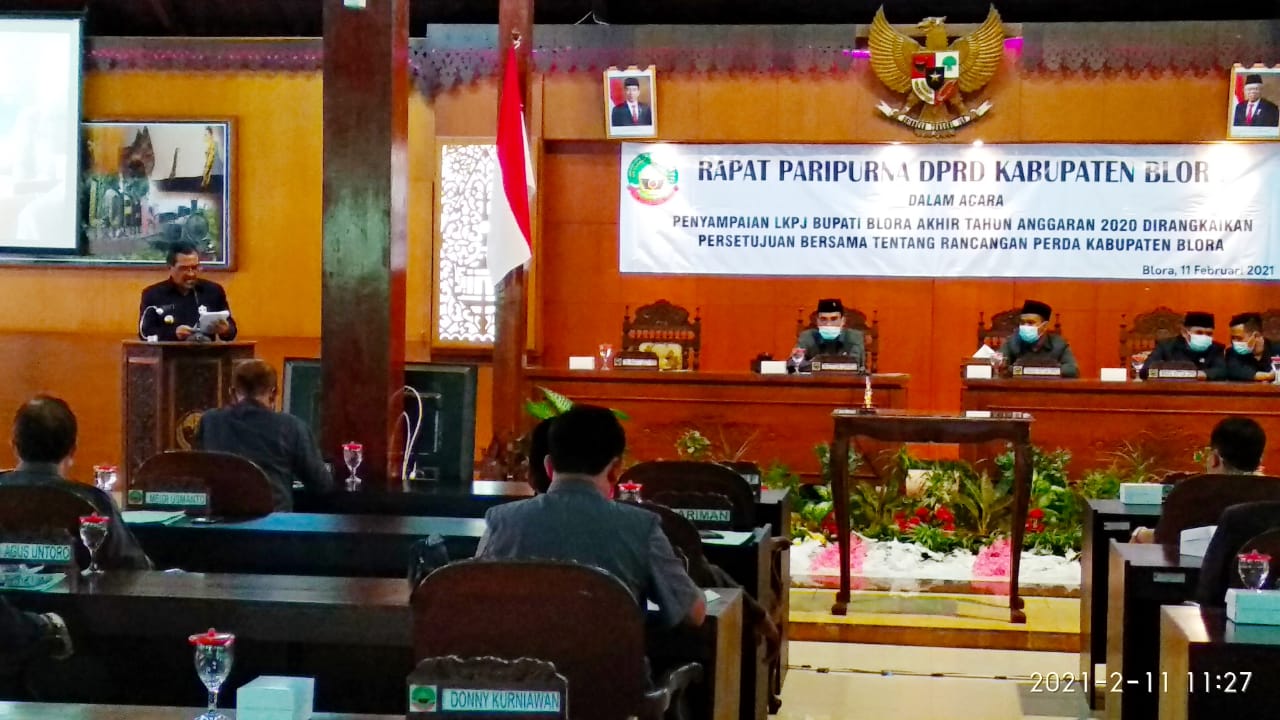 Bupati Blora, Djoko Nugroho menyampaikan LKPJ (Laporan Keterangan Pertangungjawaban) Bupati Blora Akhir Tahun Anggaran 2020 dan Perda no. 1 tahun 2011 tentang pengelolaan sampah, Kamis (11/2/2021).