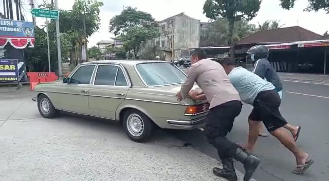 Tanpa rasa malu Kapolsek Mengwi Kompol Nyoman Darsana, S.H yang dibantu oleh pengendara lain mendorong mobil yang mogok tersebut dan mencarikan posisi parkir yang aman sehingga tidak mengganggu kendaraan lainnya sambil dilakukan perbaikan.