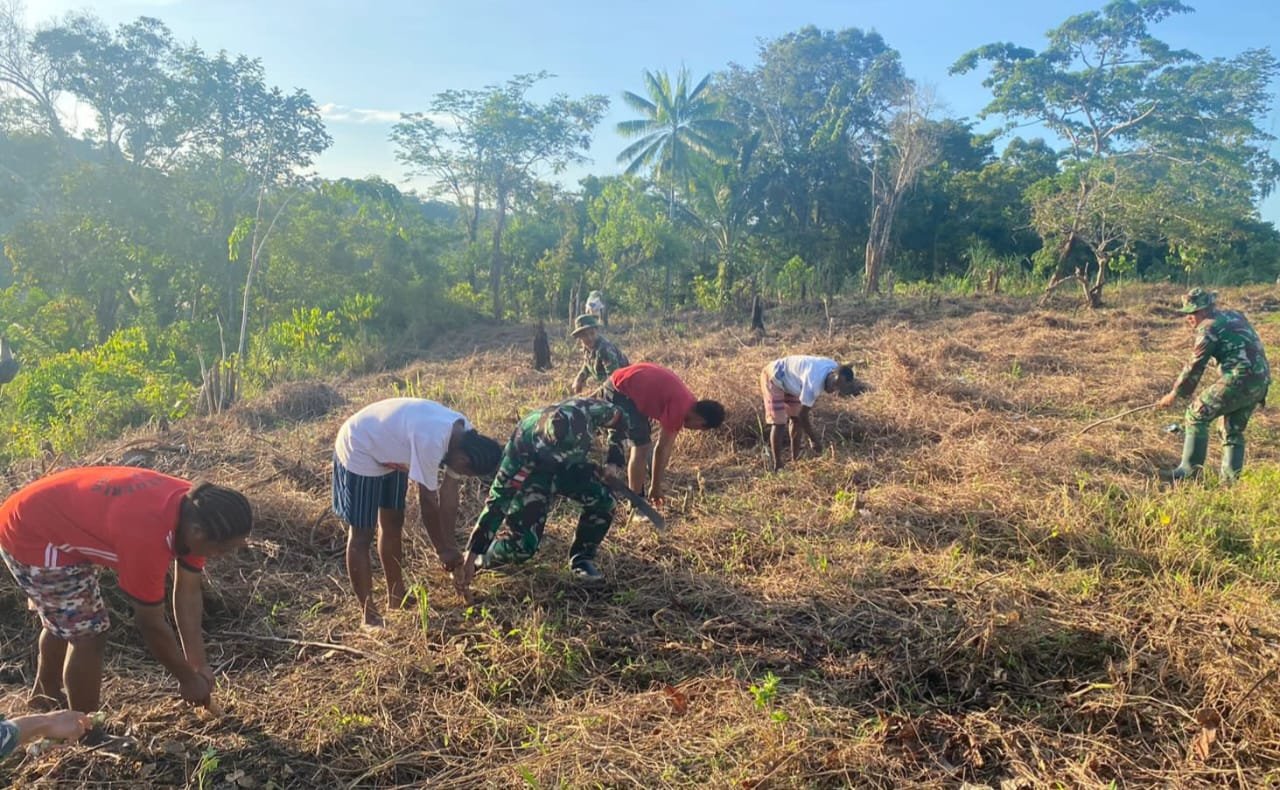 Kegiatan yang dipimpin oleh Danpos Ubrub Satgas Yonif 143/TWEJ Sertu Afnan bersama para pemuda dengan penuh semangat bekerjasama membuka lahan kosong untuk ditanami Singkong sebagai persediaan makanan masyarakat Kampung Umuaf.