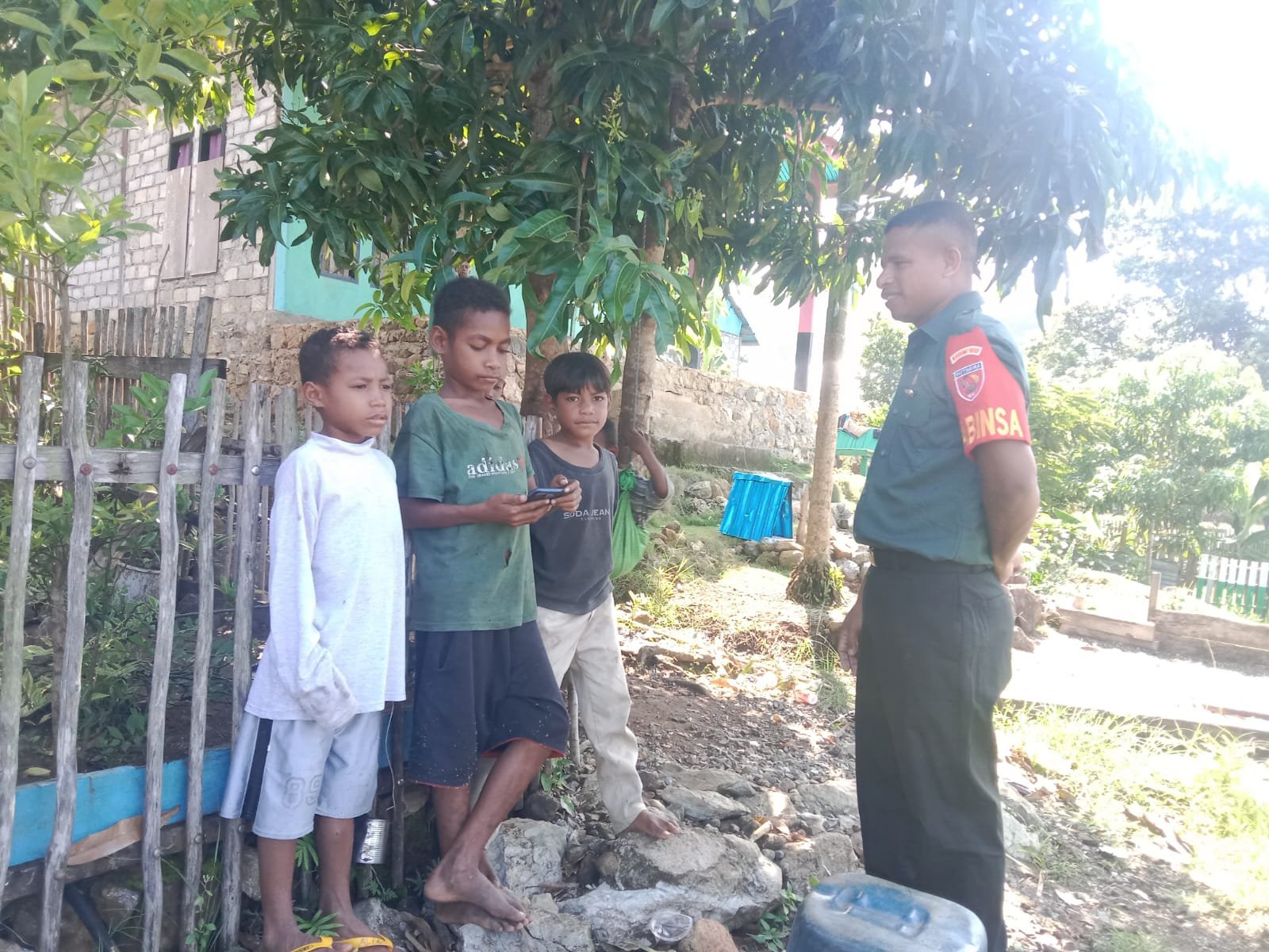 NASIONALXPOS.CO.ID,HALTENG – Babinsa Koramil 1512-02/Patani Kodim 1512/Weda, Serda Johan memanfaatkan masa libur sekolah untuk berkomunikasi Sosial (Komsos) dengan sejumlah anak-anak di Desa Palo Kecamatan Patani timur, kabupaten Halmahera Tengah (Halteng) Maluku Utara. Kamis (20/04/2023).