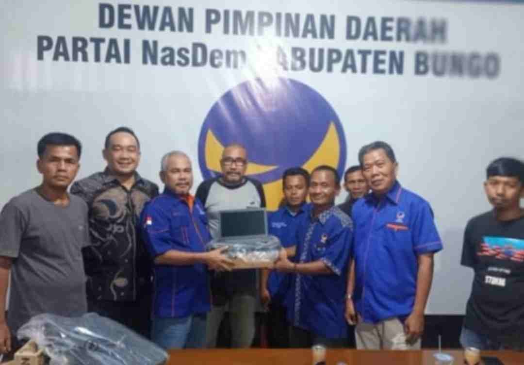Penyerahan 2 unit laptop tersebut diserahkan secara langsung oleh ketua DPD Nasdem Kabupaten Bungo Kakak Jumiwan Aguza, SM yang di terima langsung oleh sekjen DPD Nasdem Bungo Kakak Lahmudin, ST yang di dampingi oleh seluruh segenap pengurus DPD Nasdem Bungo.