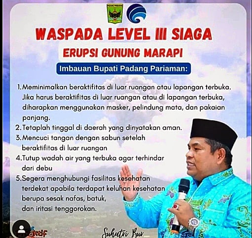 NASIONALXPOS.CO.ID, PADANG PARIAMAN – Pada hari Selasa, 9 Januari 2024 pukul 18.00 WIB, Badan pusat Vulkanologi dan Mitigasi Bencana Geologi menyebutkan bahwa saat ini status gunung marapi naik status dari level II Ke- Level III siaga, menanggapi peningkatan status Gunung Marapi tersebut, Bupati Padang Pariaman Suhatri Bur,SE mengeluarkan imbauan kepada warga agar hati-hati dan waspada terhadap dampak abu vulkanik gunung Marapi yang sebarannya sampai ke wilayah Padang Pariaman, (14/1/23).