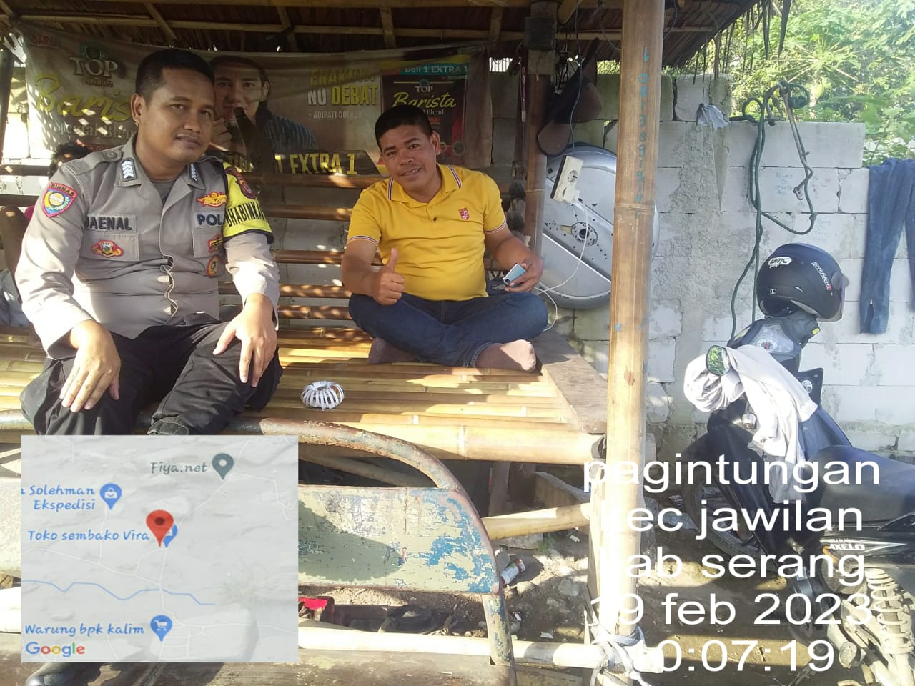 NASIONALXPOS.CO.ID, SERANG – Bhabinkamtibmas Desa Pagintungan Polsek Jawilan Polres Serang Bripka Jaenal laksanakan giat Sambang ke warga desa binaannya di Kampung Leah Desa Pagintungan Kecamatan Jawilan, Kabupaten Serang, Minggu (19/2/2023).