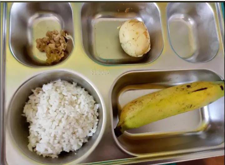 Dalam dokumentasi yang beredar, paket MBG yang dibagikan hanya berisi seporsi nasi putih, satu butir telur rebus, sedikit tempe orek, dan sebuah pisang. Beberapa sekat wadah makan berbahan aluminium bahkan tampak kosong tanpa isi.