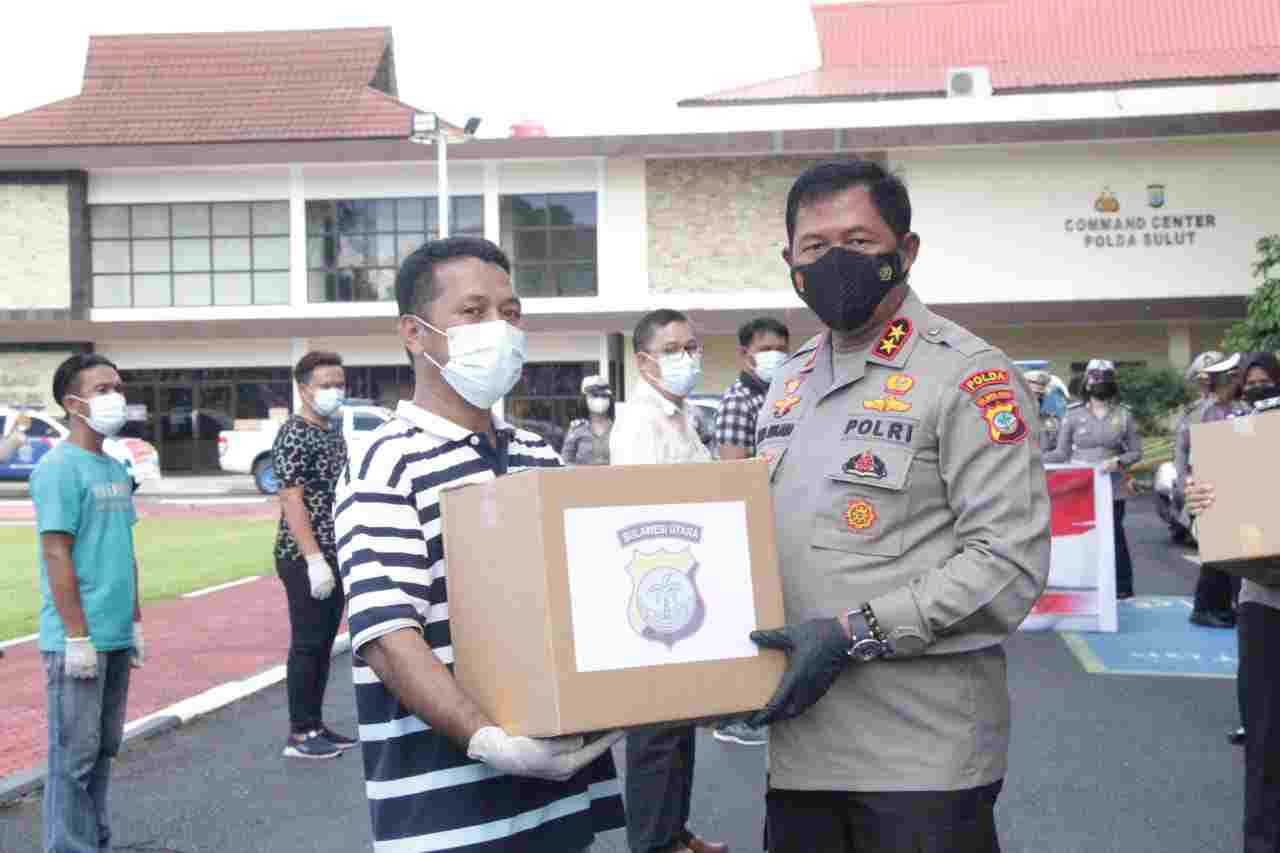 Penyerahan sembako, masker dan hansanitizer dilaksanakan secara simbolis di halaman Mapolda Sulut, Jumat (25/6/2021) pagi, dihadiri oleh Kapolda Sulut Irjen Pol Nana Sudjana, Wakapolda Sulut Brigjen Pol Rudi Darmoko, Ketua Bhayangkara Sulut Ny. Shinta Nana Sudjana, para PJU Polda dan Pengurus Daerah Bhayangkari Sulut.