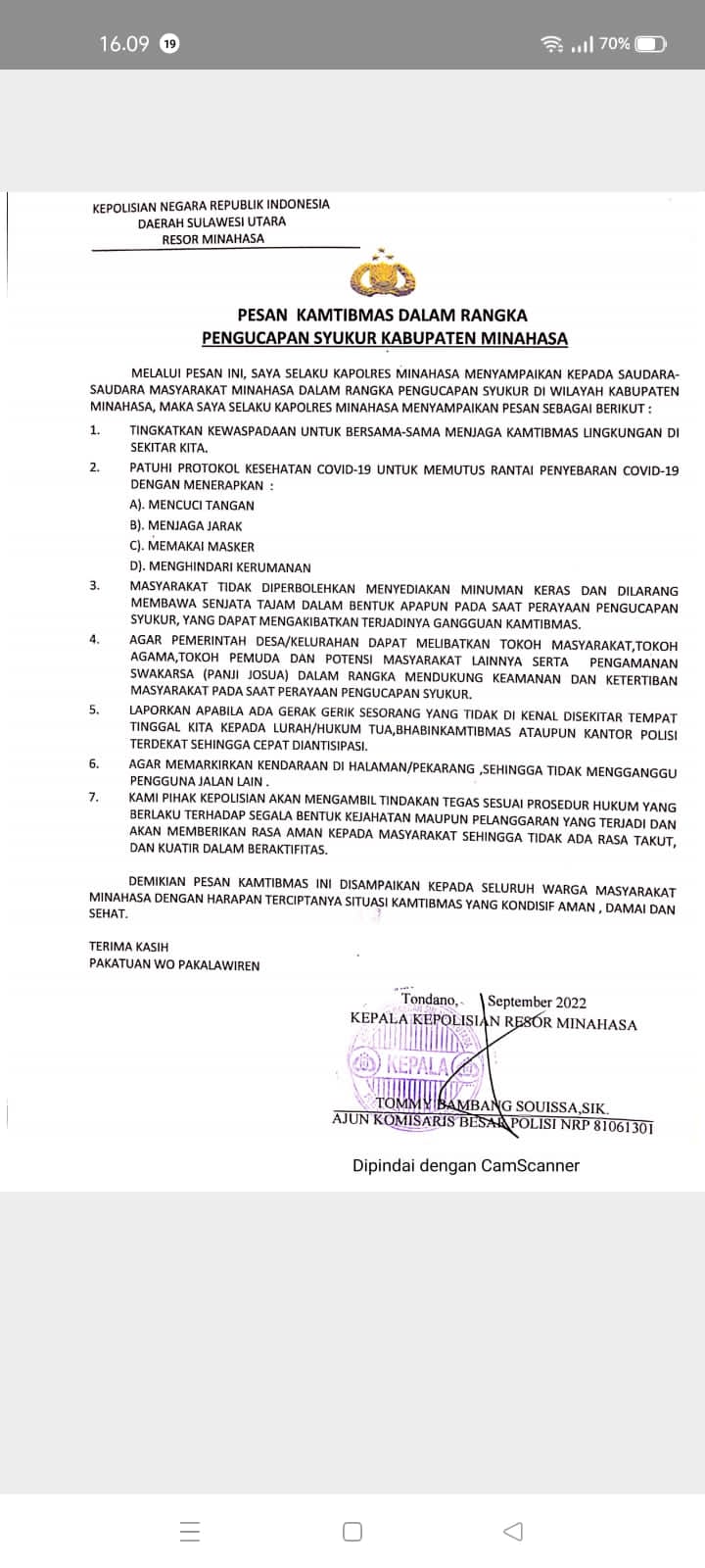 Demikian bentuk 7 Pesan Kapolres Minahasa dalam pesan Kamtibmas dalam rangka menyambut pengucapan syukur di Wilayah Hukum Polres Minahasa.